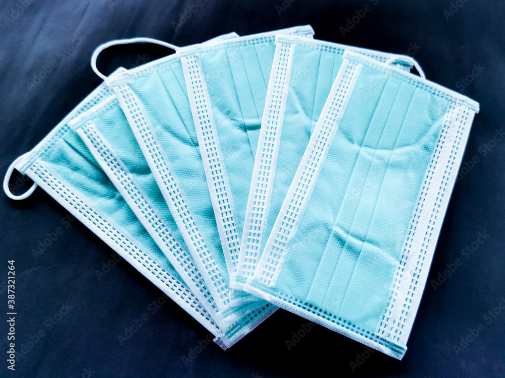 Blue surgical face mask on black background, Health care concept and can protect virus covid-19, medical masks, fabric mask protect air pollution