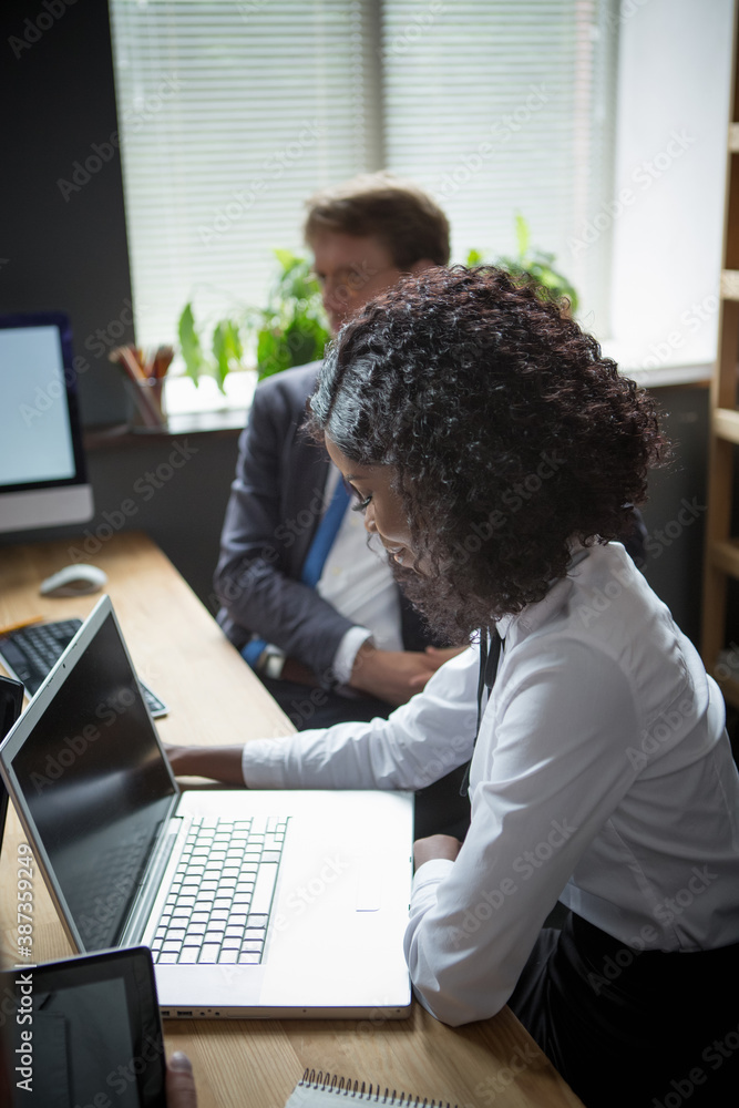 Profile of beauty African American woman using laptop computer at business meeting. Teamwork of diverse group concept.