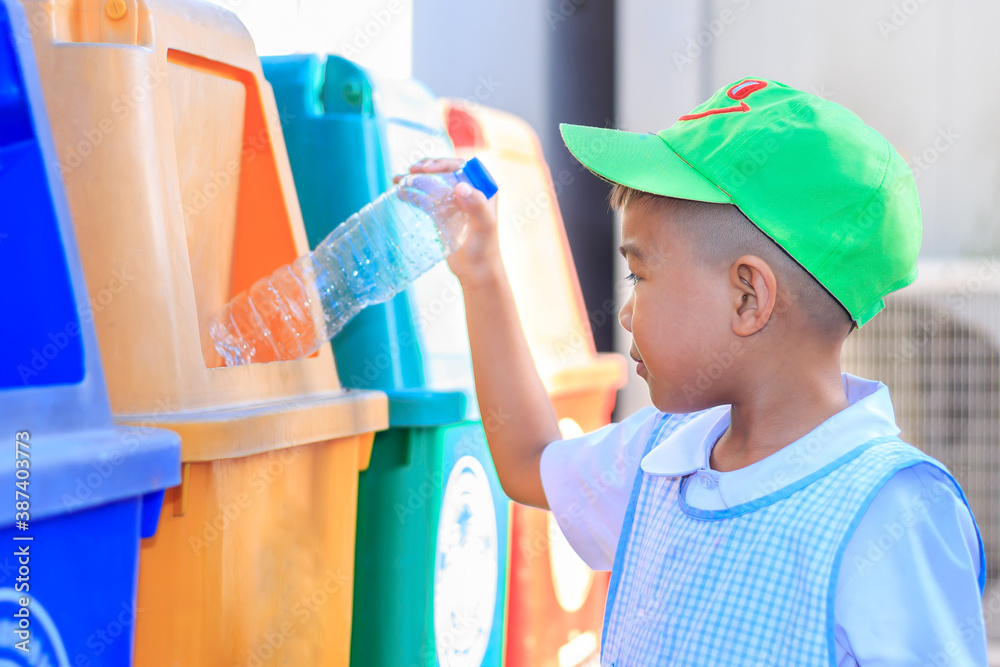 Portrait image of 5-6 years old of child. Happy Asian child boy throwing a plastic bottle into a recycle bin. Save environmental concept.