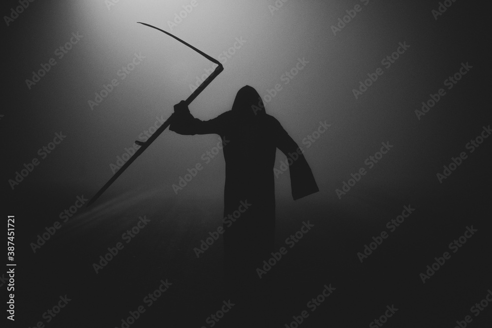 Death grim Reaper skeleton wearing a black robe and wielding a scythe, Memento Mori, Coronavirus, Epidemic Pandemic Time