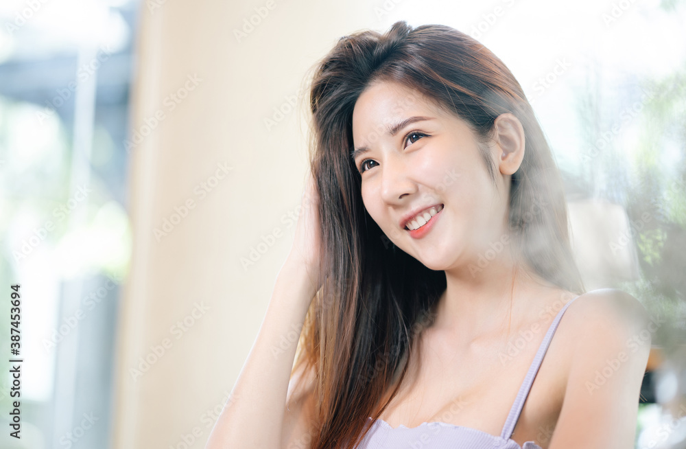 Portrait of young Asian woman smiling friendly wearing blank vest looking away while sitting at cafe with copy space.Woman lifestyle, Happiness, Holiday concept.