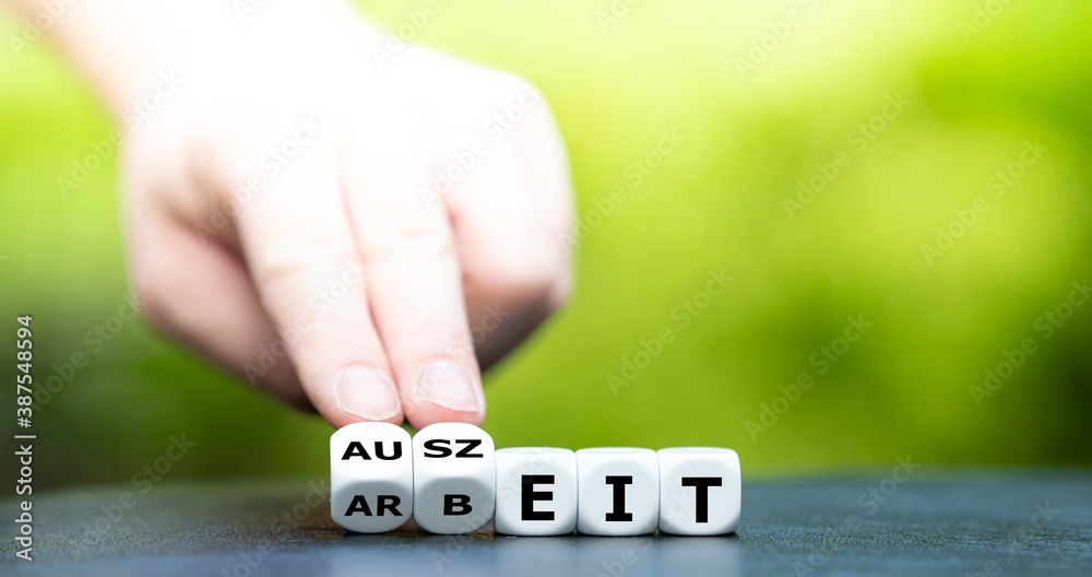Hand turns dice and changes the German word "Arbeit" (work) to "Auszeit" (time off).