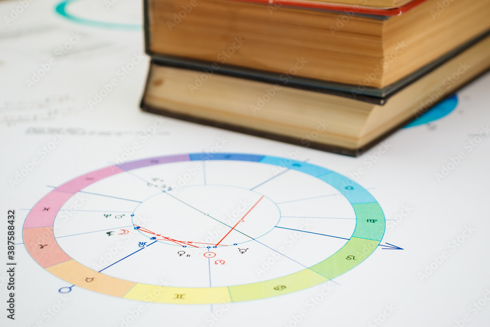 Workplace of a modern astrologer. Lying on the table are printouts of clients astrological charts. Stacks of astrology books, yellowed with age.
