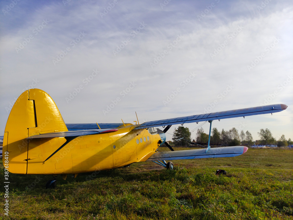 Yellow and blue old biplane plane with a single piston engine and propeller against a blue sky with clouds on the airfield with green grass in summer