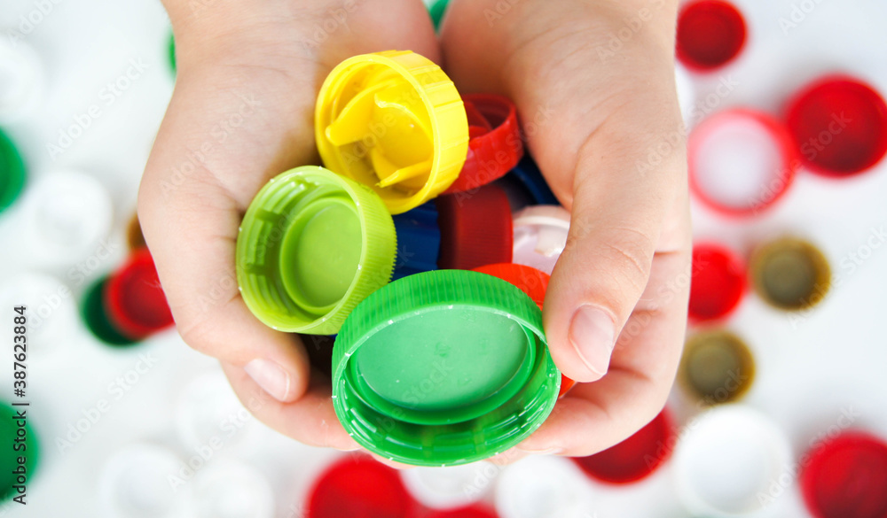 Childs hands holding colourful plastic bottles caps for recycling to conserve the environment. White background. Recycling and protection Earth concept.