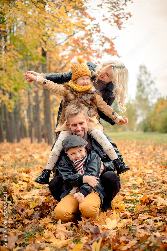 Family make people pyramid. leaf fall, lifestyle. Autumn season.