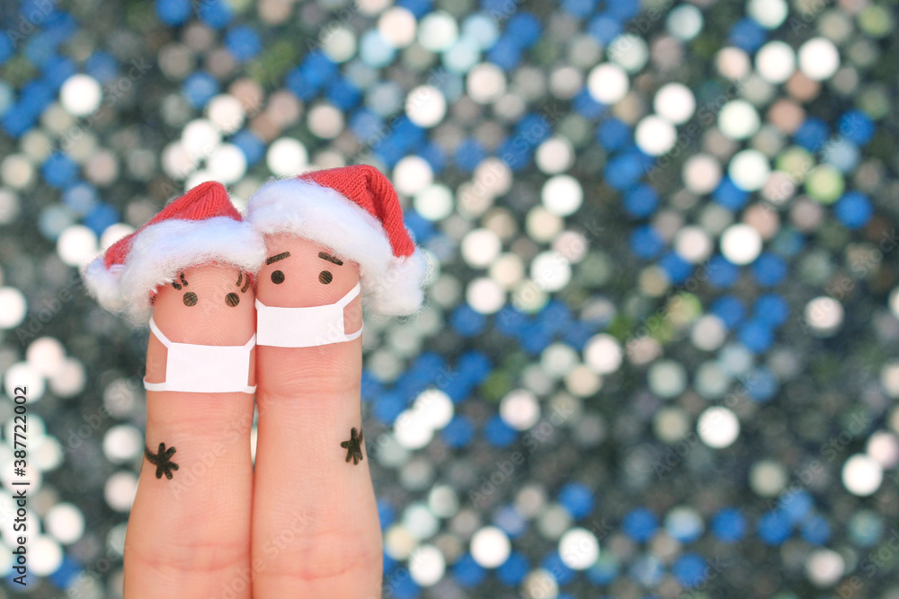 Fingers art of couple in medical mask from COVID-2019 celebrates Christmas. Concept of people in New Year hats.