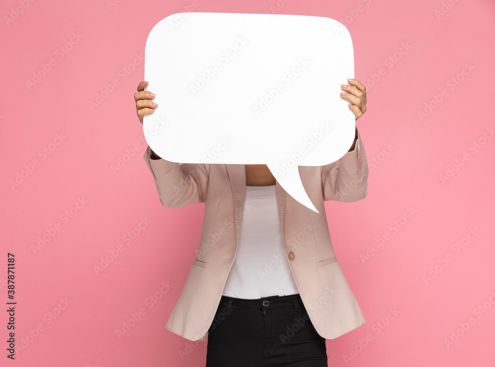 businesswoman hiding behind a speech bubble