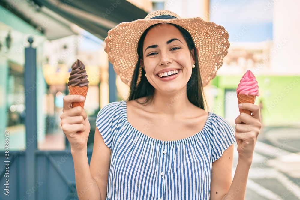 Young latin tourist girl on vacation smiling happy eating ice cream at the city.