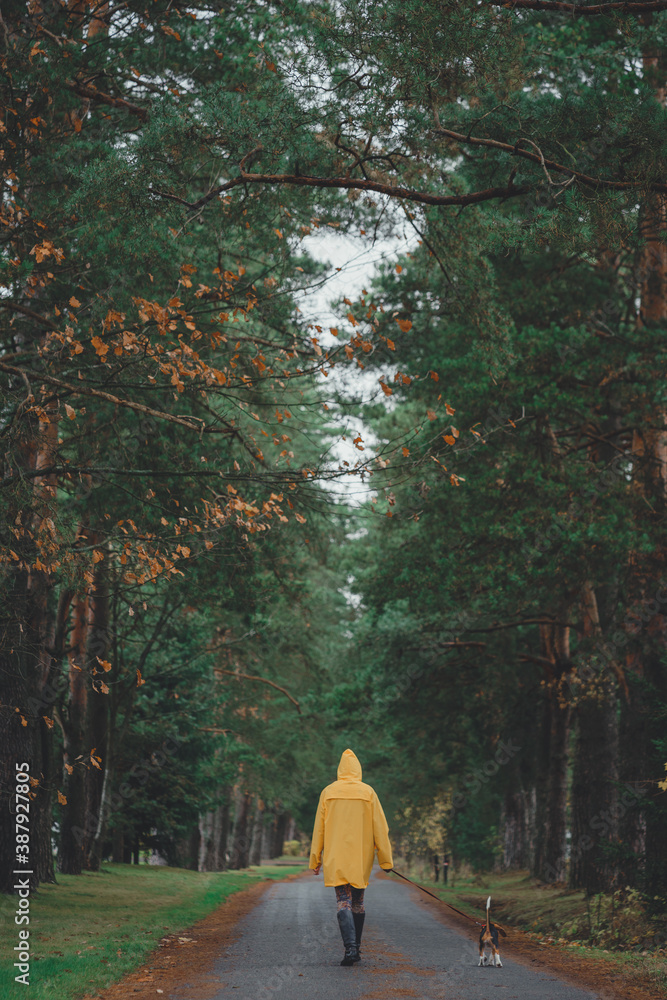 Girl in a bright yellow raincoat with beagle puppy, walks along the road in a beautiful autumn forest.