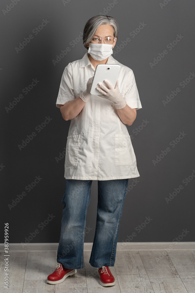 Female doctor wearing white coat and jeans full length. Mature woman in protective mask working with digital device.