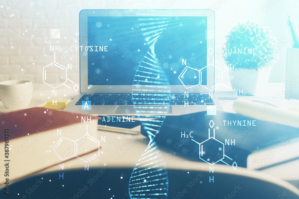 Desktop computer background and DNA drawing. Double exposure. Science concept.