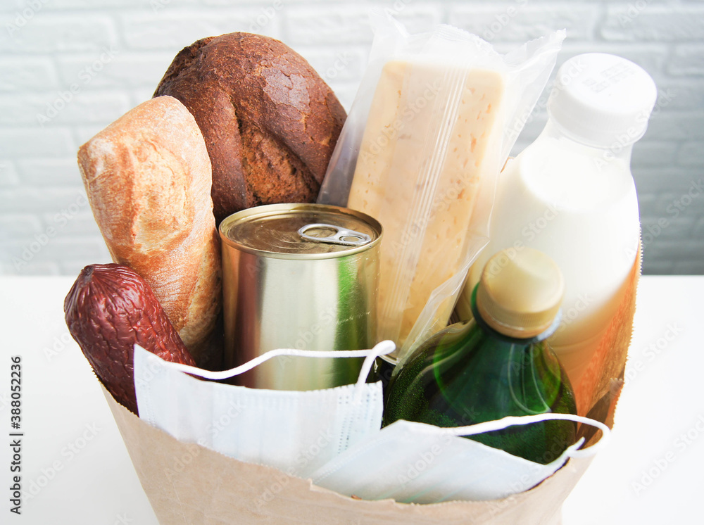Online purchase of products and protective medical masks during the quarantine coronavirus Covid-19 period. Self-isolation, stay at home. Free food delivery.