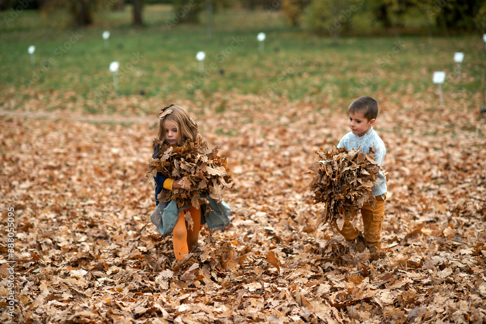 A couple of children playing with leaves