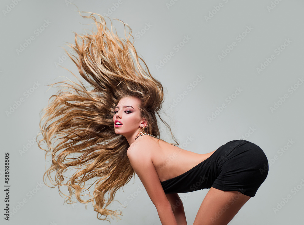 Hair in motion. Face of the Beautiful young girl with long straight hair, posing in studio, gray isolated. Sensual woman look.
