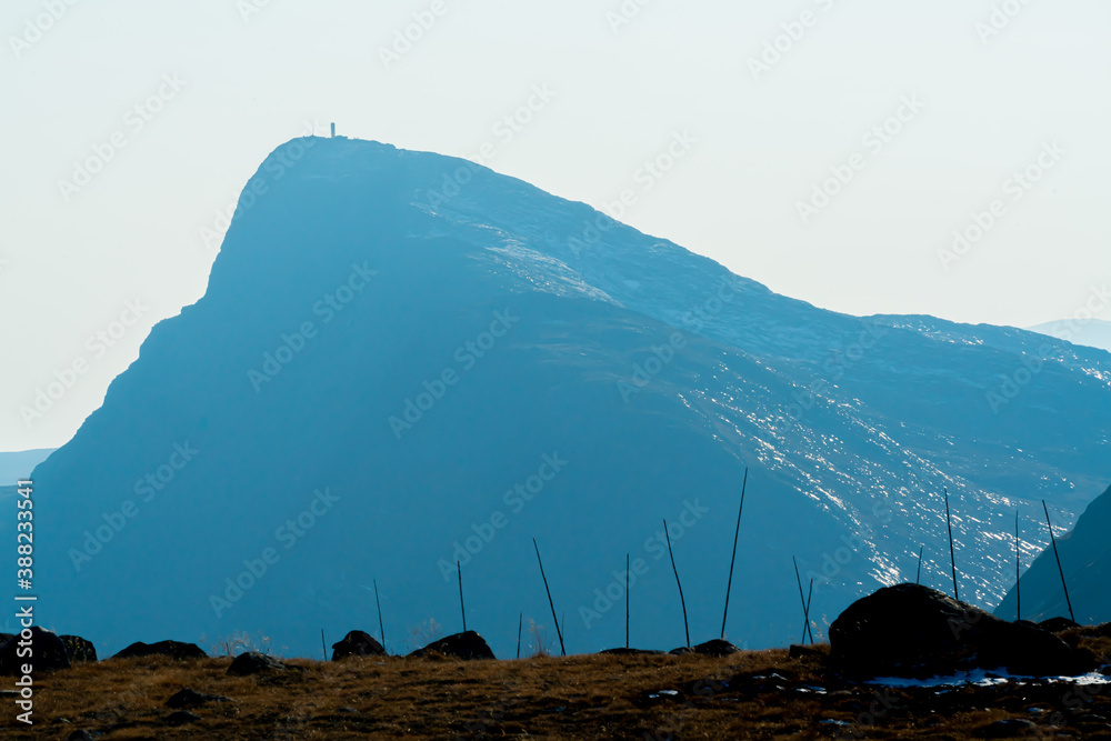 Mount Bitihorn in Norway at a distance with blurry white haze in the background.