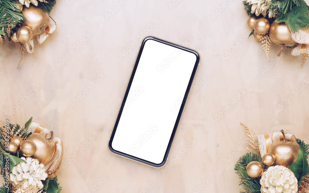 Mockup Smartphone with blank screen in Christmas frame. Merry Christmas and Happy New year background with empty smartphone on wood table background, copy space for text or advertisement.