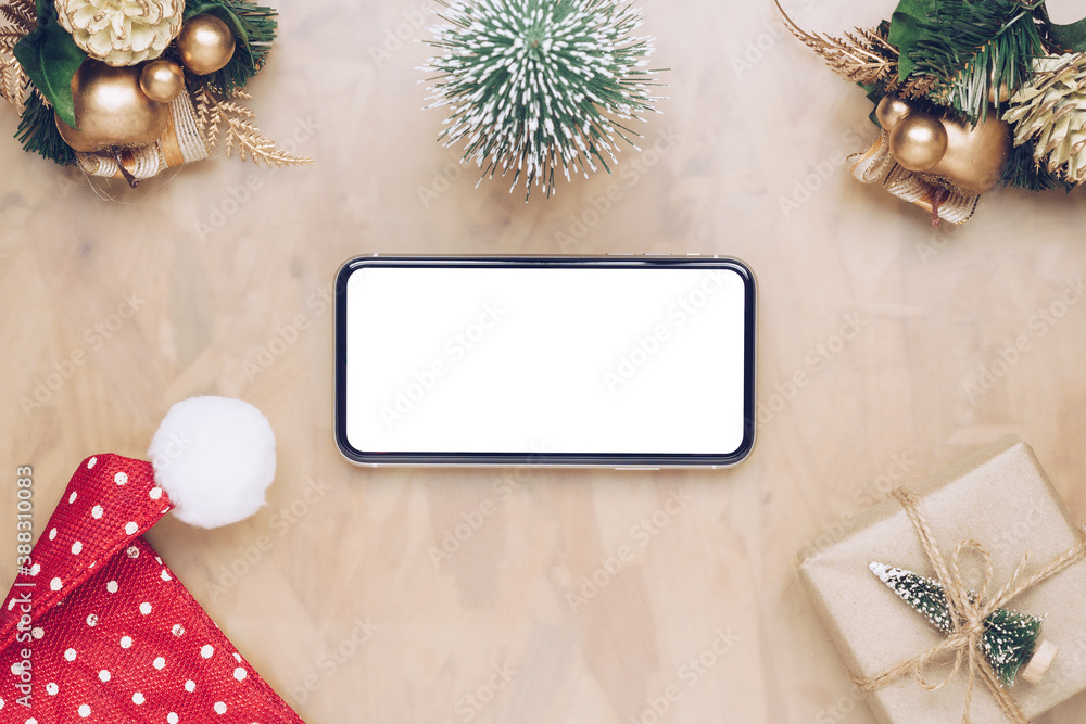 Mockup smartphone with blank white screen, new year gift box with Xmas pine tree model, christmas ornaments, santa claus hat on wood background, top view, place for your artwork