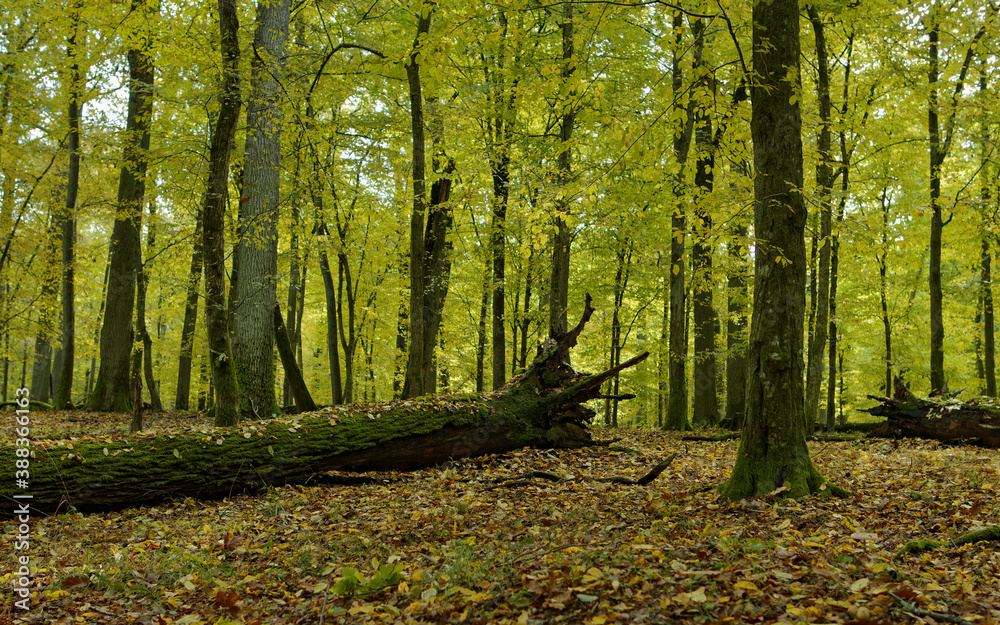Dead, fallen tree in autumnal forest. Dead tree trunk covered in moss. Nature Reserve Brzeki, Poland, Europe.