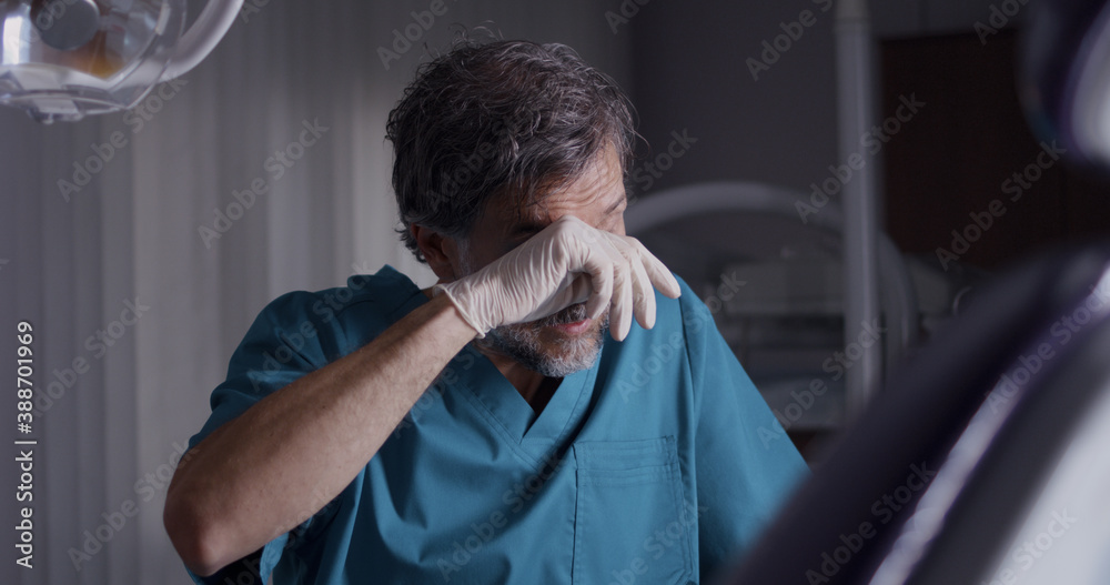Mature exhausted dentist lately in clinic