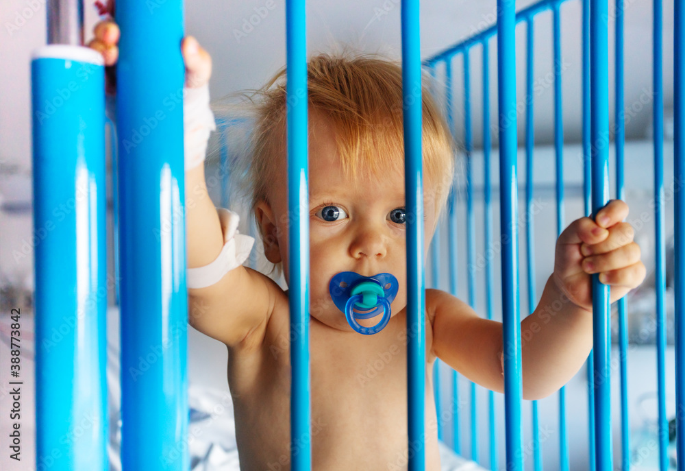 Close photo portrait of a little toddler stand in hospital bed with frame, catheter in his hand holding pacifier