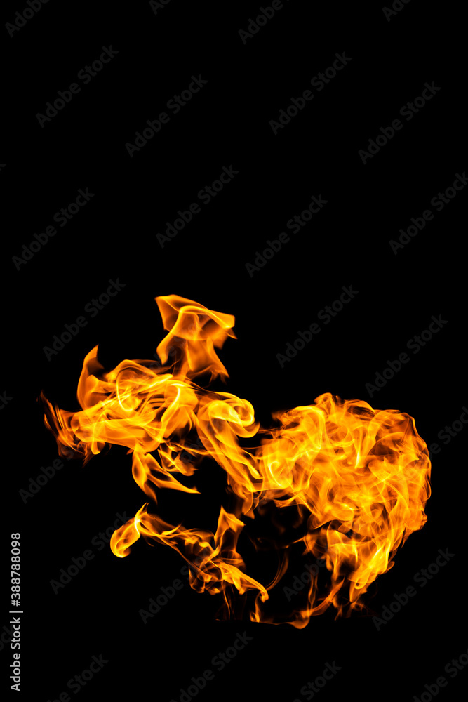 Fire flames on black background isolated. Burning gas or gasoline burns with fire and flames. Flaming burning sparks close-up, fire patterns. Infernal glow of fire in the dark with copy-space