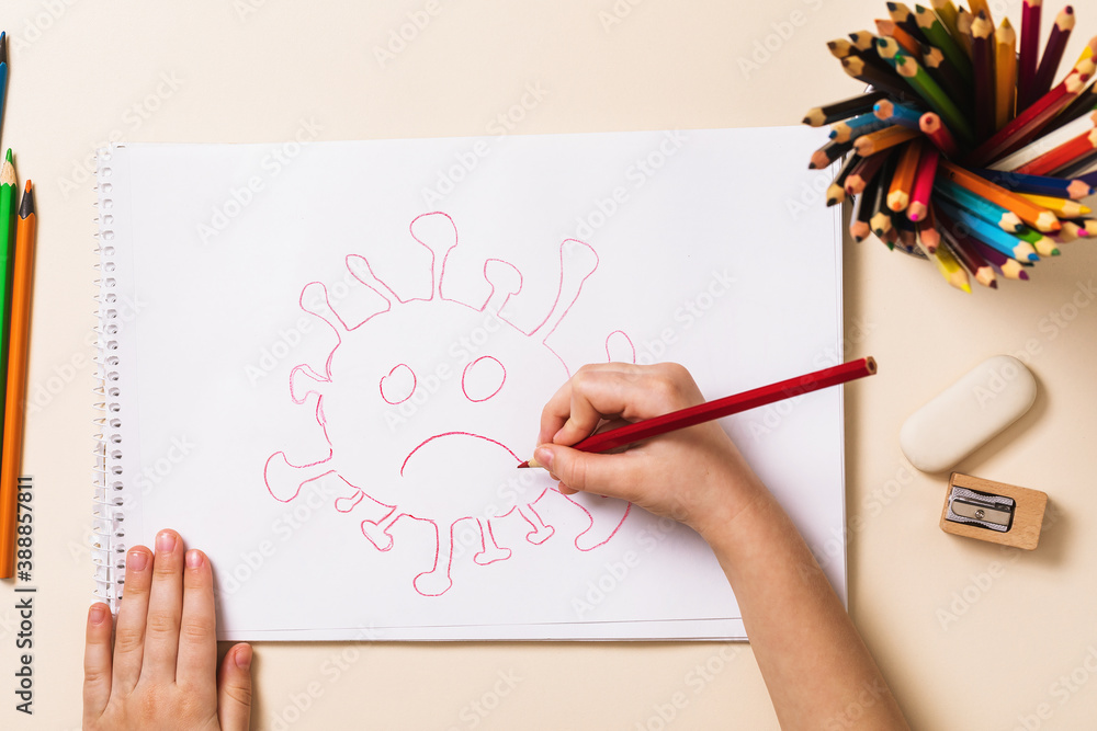 A small child in quarantine draws a coronavirus bacterium, top view