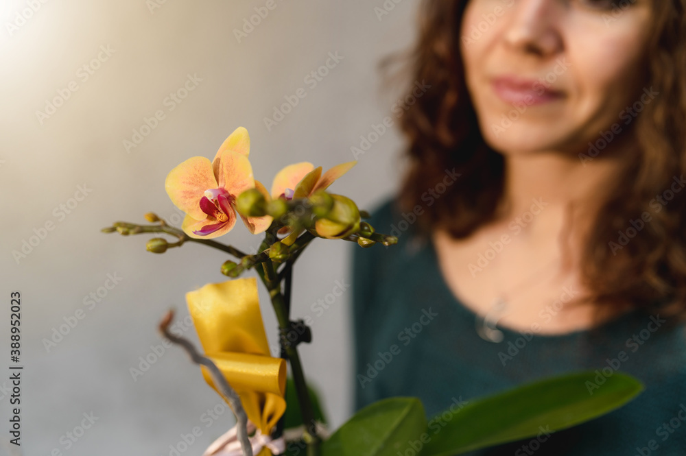 Close up yellow orchid. Young caucasian woman in the back holding the little plant. Green thumb, growth concept.