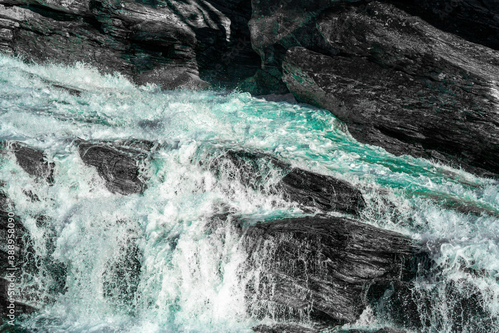 Wild and fast moving river rapids white water rushing over rugged cliffs. Close up.