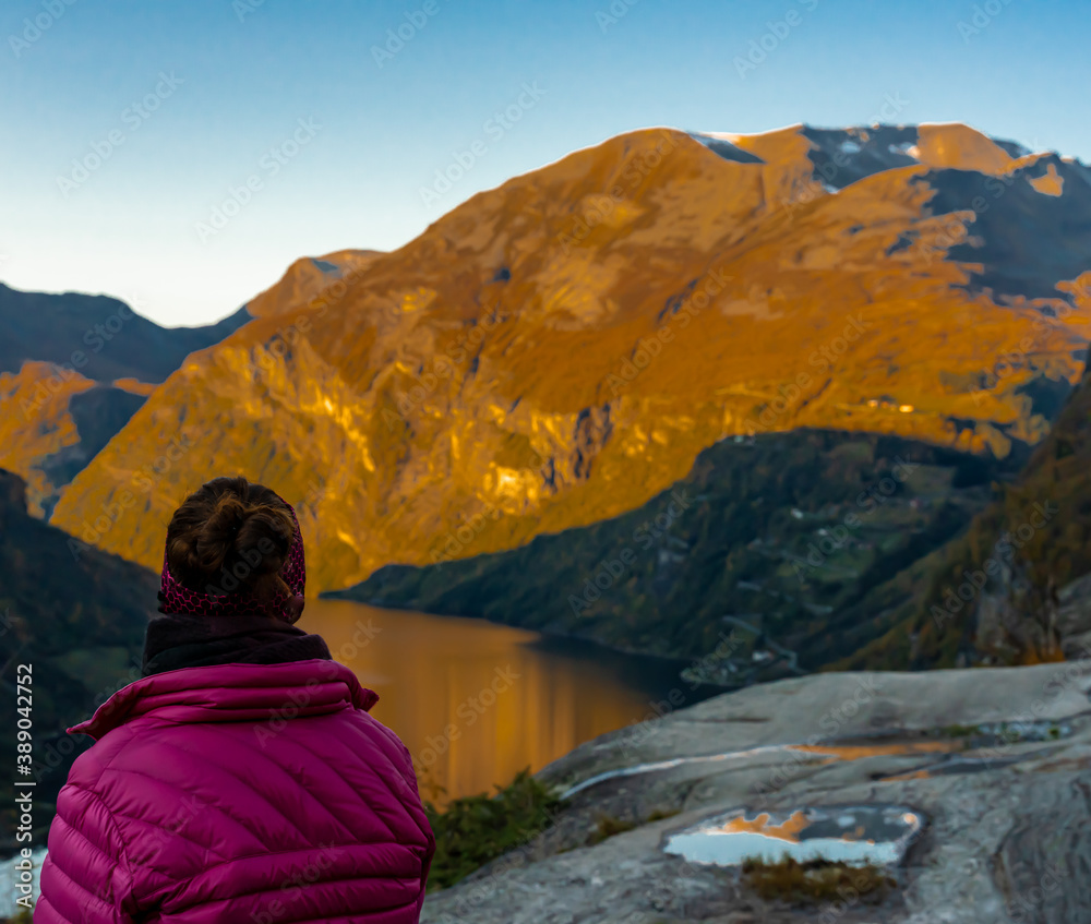 Female tourist enjoying the view over the famous Norwegian Geiranger fjord.