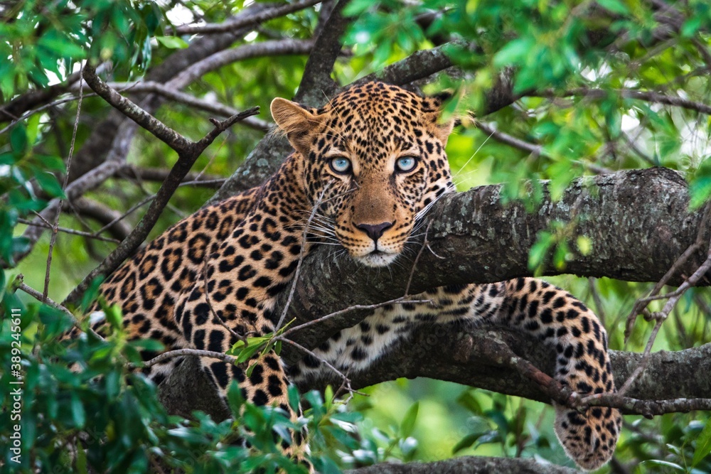 Adult leopard portrait on a tree with blue eyed stare. Kenya, Africa.