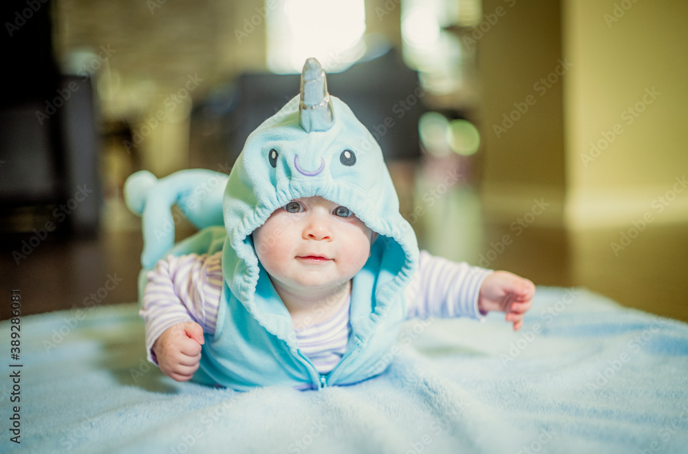 Baby narwhal doing superman tummy time exercises holiday halloween costume