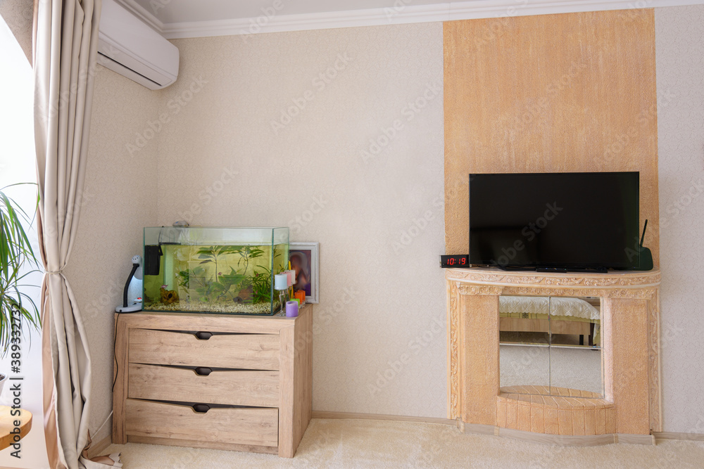 A corner in the room, there is an aquarium, an air conditioner hangs and a stylized place for a TV