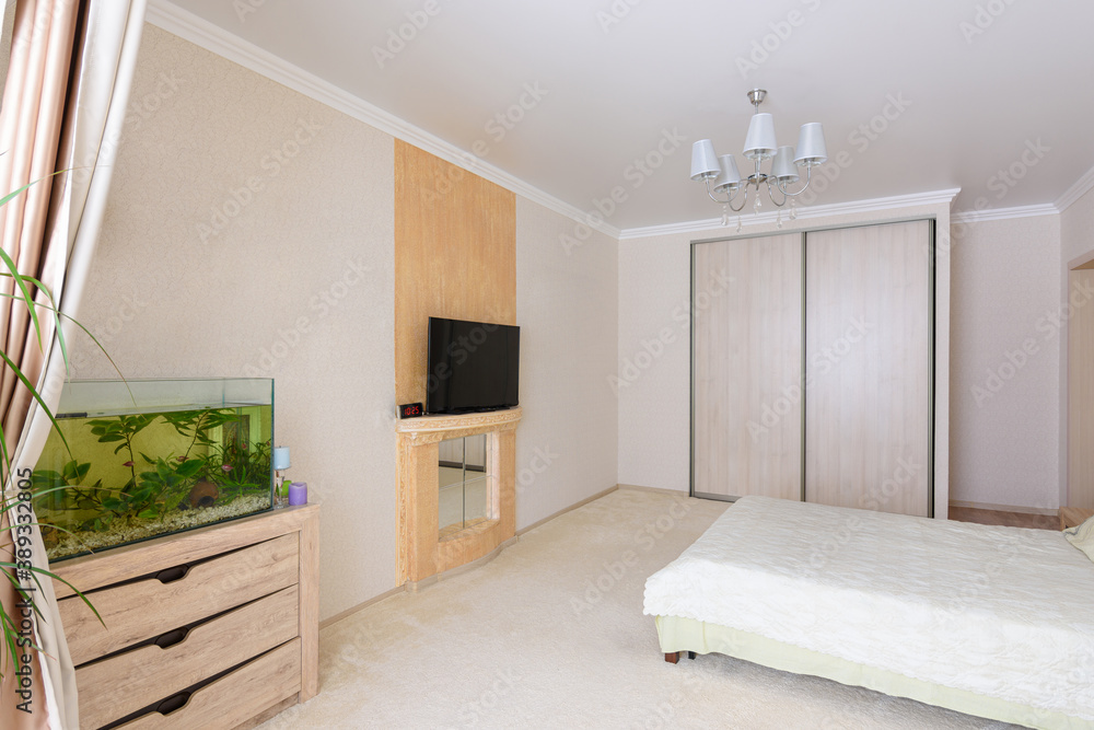 Interior of a spacious bedroom, stands an aquarium, TV and wardrobe
