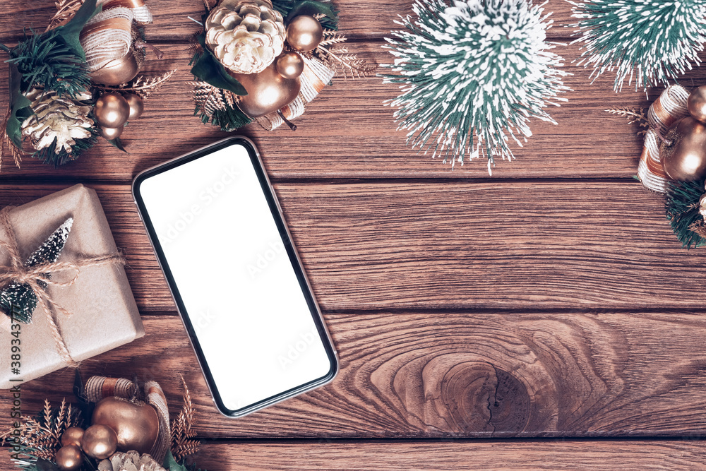 Mockup smartphone with blank white screen, new year gift box with Xmas pine tree model, christmas ornaments on wood background, top view, place for your artwork