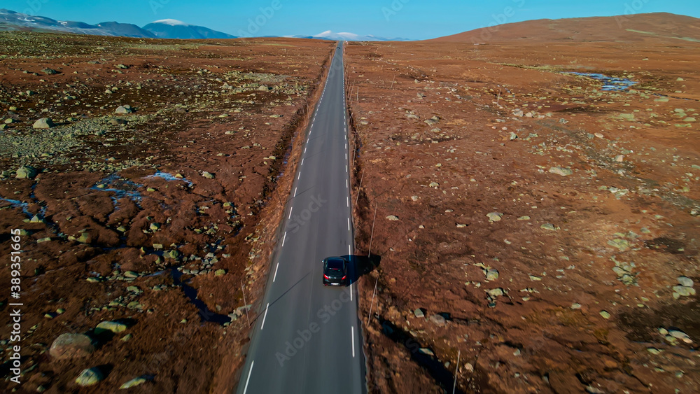 Car driving on a road in mountain highlands in autumn colors. Aerial photo with motion blur.