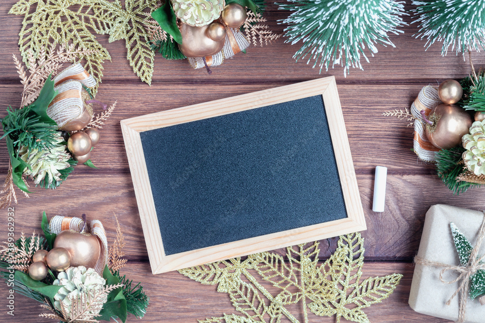 Mockup chalkboard with blank empty screen, new year gift box with Xmas pine tree model, christmas ornaments on wood background, top view, copy space place for your artwork
