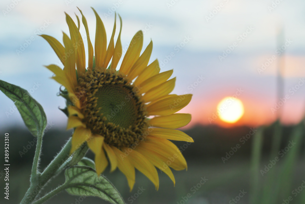 Sunflower and the sun. Single yellow flower in the field at sunset sunrise background. Floral nature for inspirational inspiration concept backgrounds.
