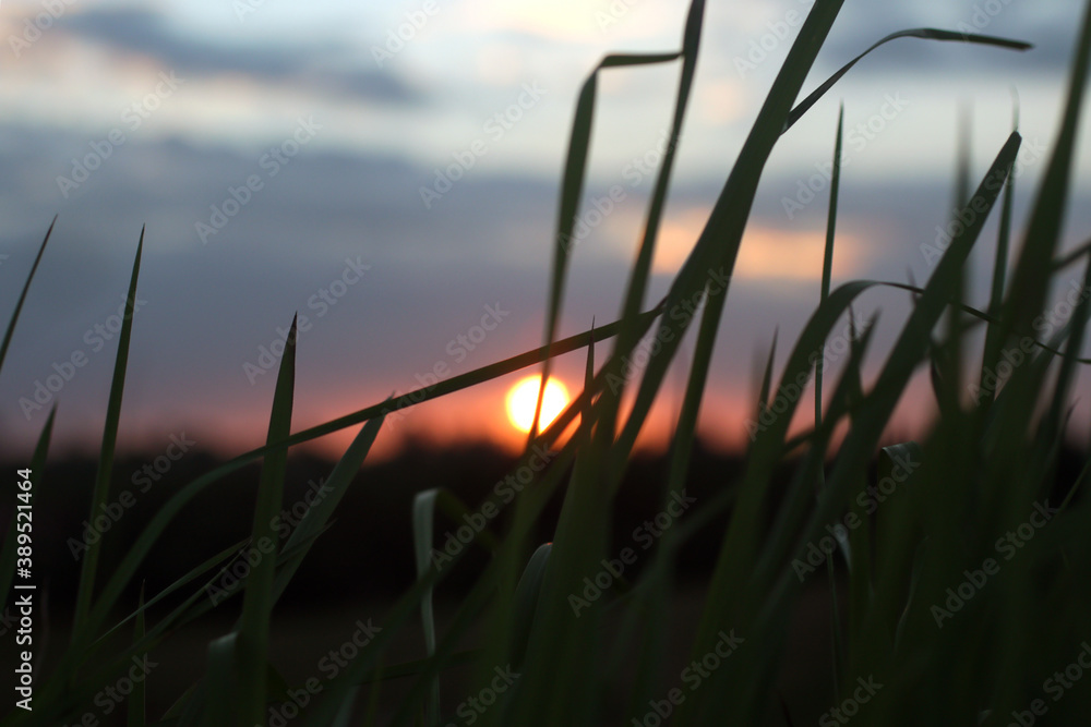 Sunset over the field. Peeking the sun down behind the grass. Sunset sunrise backgrounds. Abstract nature background. Background for inspiration inspirational image concept.