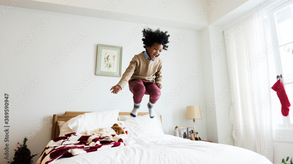 Young kid having a fun time jumping on the bed