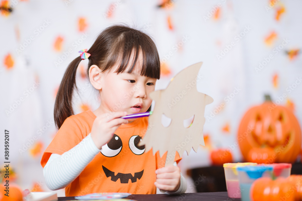 young girl painting witch mask for halloween party at home