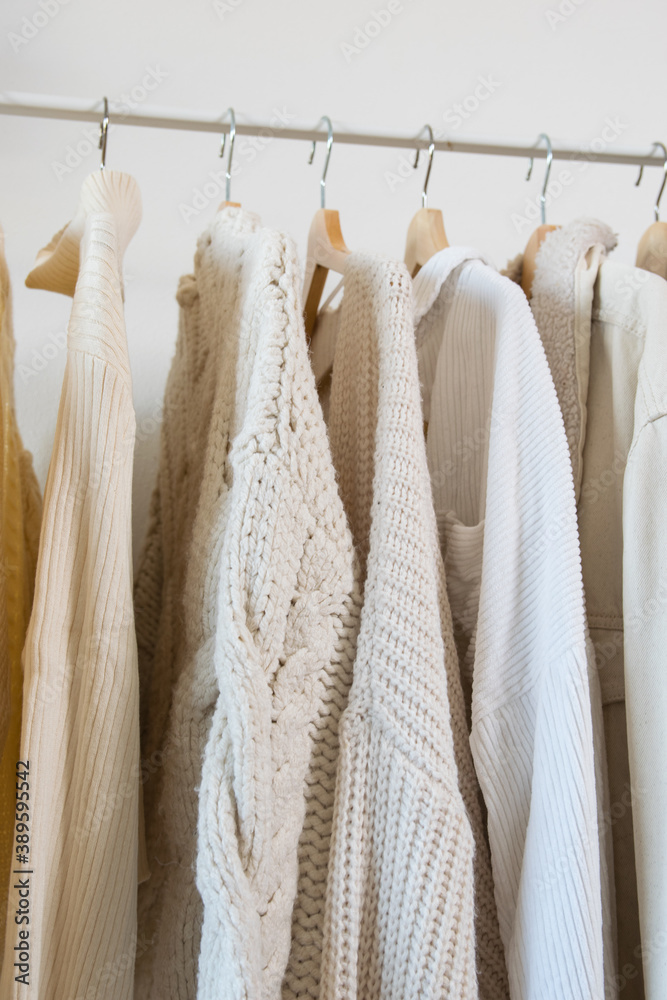 closeup of warm clothes of light colors like beige or white for winter hanging and clean on hangers