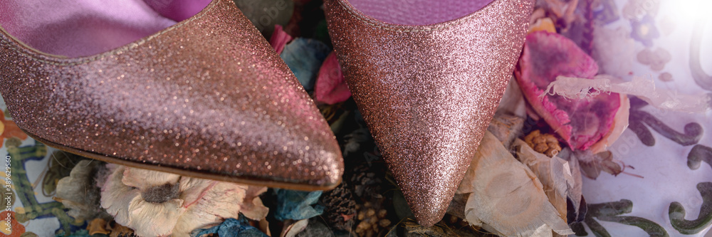 Horizontal banner closeup with pink and purple shoes with glitter and high-heels. Fashion glamour details concept.