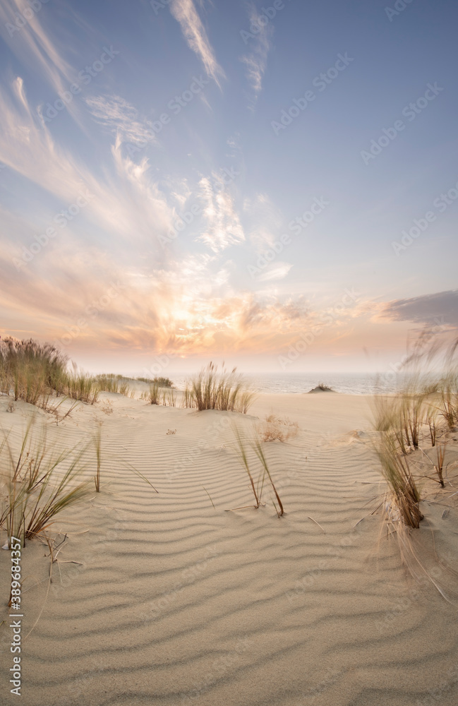 Sand dunes in Kaliningrad. Natural background. Sunrise.