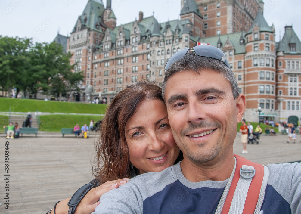 Happy young couple smiling for a selfie in front of Chateau Frontenac, Quebec City