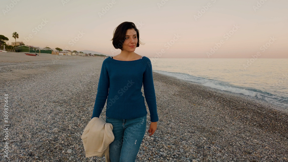 Ragazza con maglia blu e giacca marrone passeggia in riva all'oceano