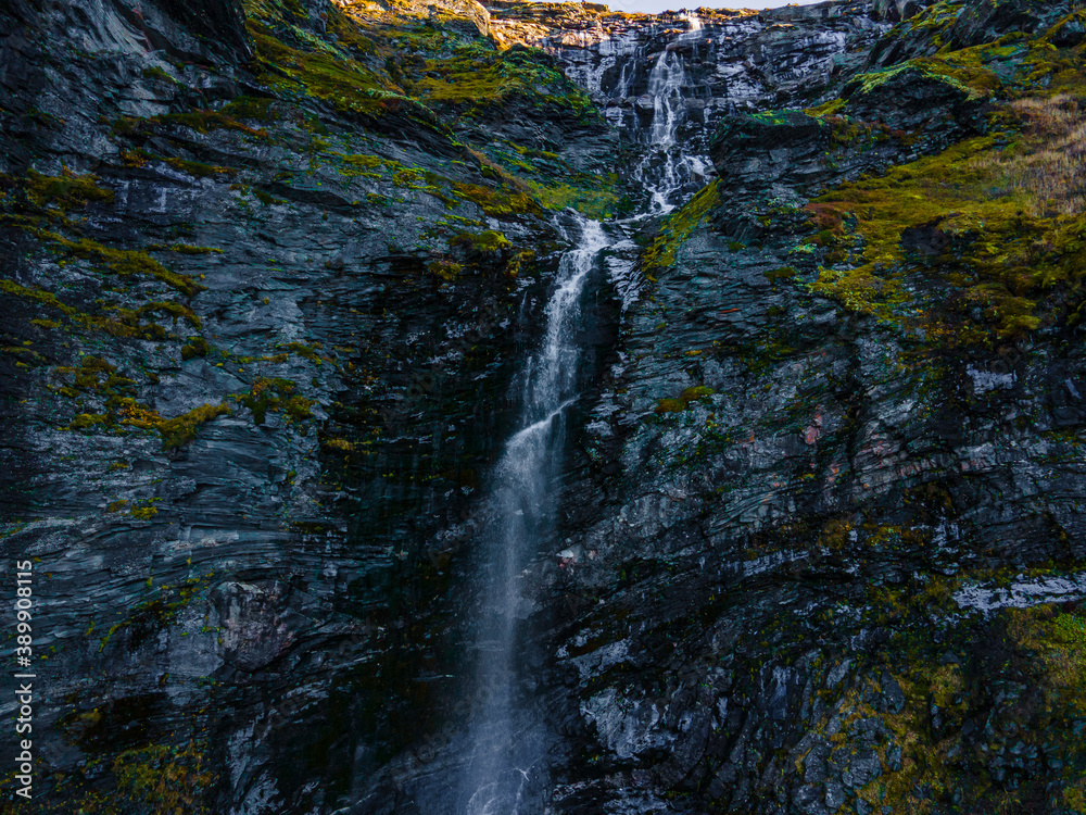 Large waterfall on a mountain side with green turf and large boulders.