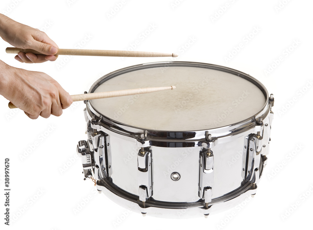 Male hand playing big metal snare drum isolated on white