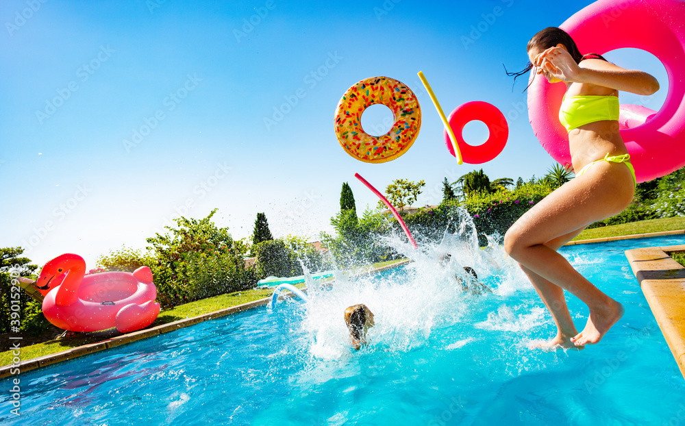 Happy teenage kids with inflatable buoys splash dive into swimming pool jumping together view from side