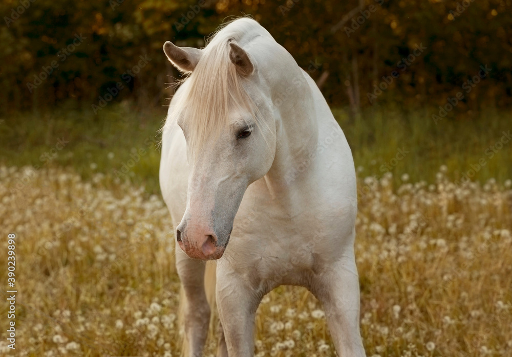 the most beautiful white Arabian horse shows his temperament and beauty on summer sunset on dreamy dandelion meadow in golden hour